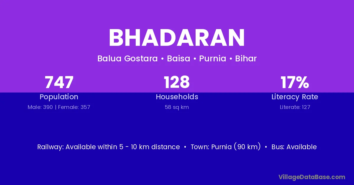 Purnia (90 km) is the nearest town to Bhadaran village for major economic activities and is located approximately 90 km away.