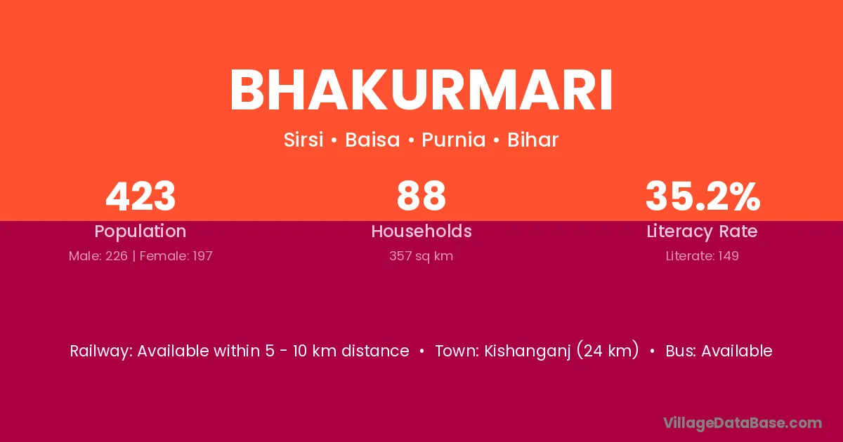 Kishanganj (24 km) is the nearest town to Bhakurmari village for major economic activities and is located approximately 24 km away.