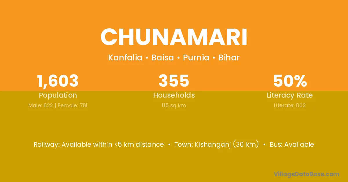 Chunamari village has a total population of 1,603 people, of which 822 are males and 781 are females.