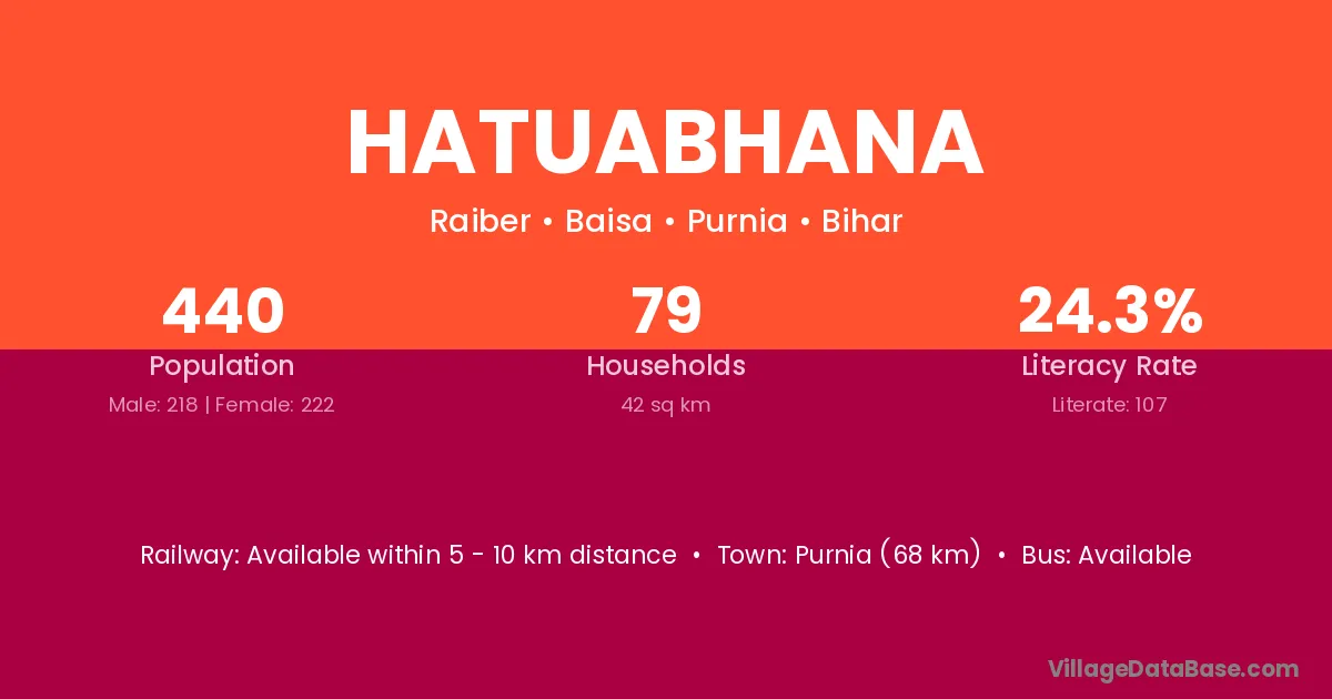 Purnia (68 km) is the nearest town to Hatuabhana village for major economic activities and is located approximately 68 km away.
