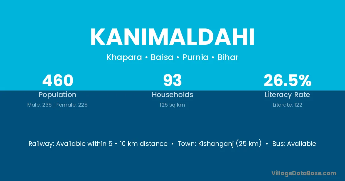 Kishanganj (25 km) is the nearest town to Kanimaldahi village for major economic activities and is located approximately 25 km away.