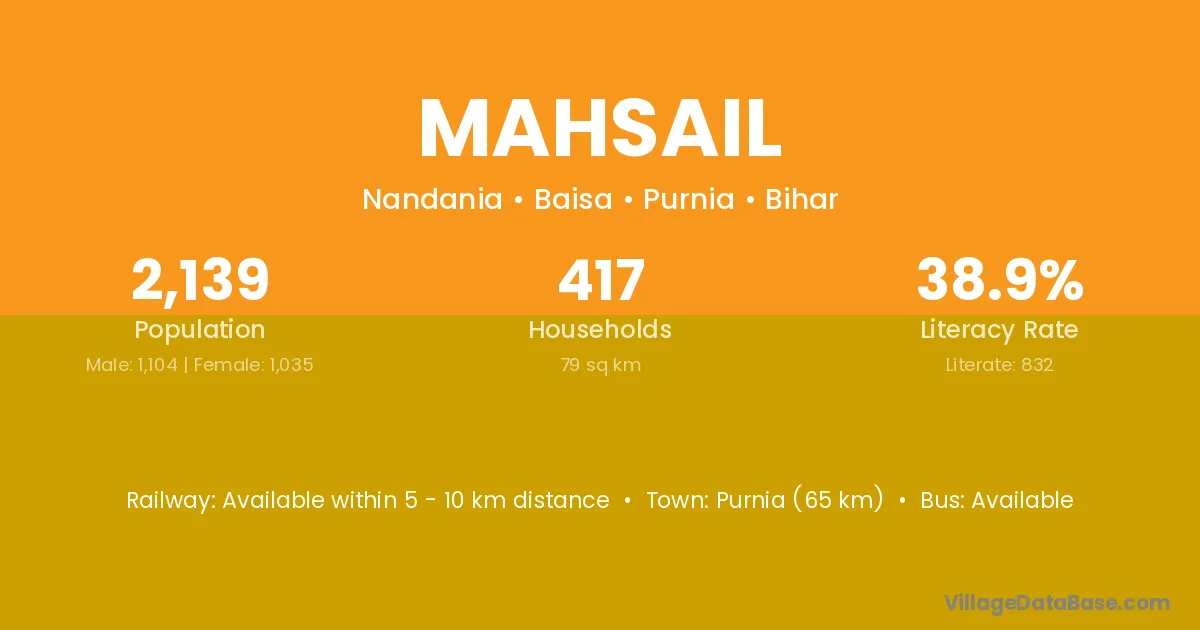 Purnia (65 km) is the nearest town to Mahsail village for major economic activities and is located approximately 65 km away.