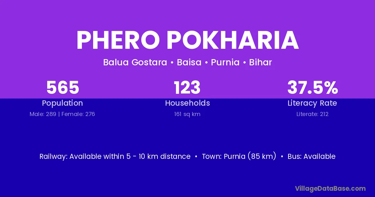 Purnia (85 km) is the nearest town to Phero Pokharia village for major economic activities and is located approximately 85 km away.