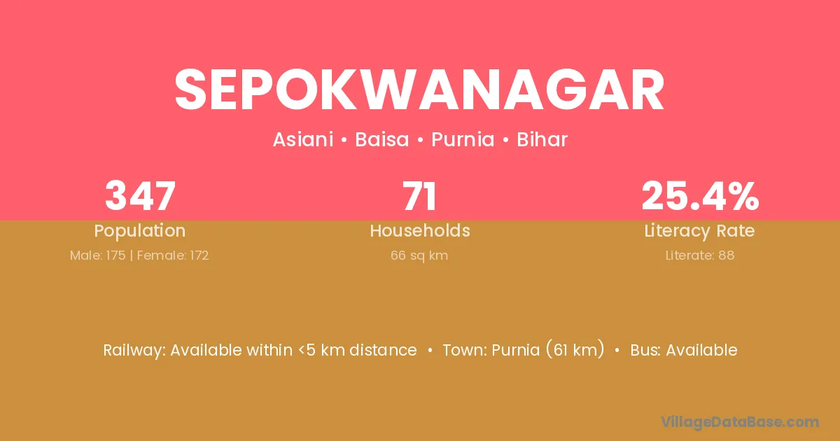 Purnia (61 km) is the nearest town to Sepokwanagar village for major economic activities and is located approximately 61 km away.