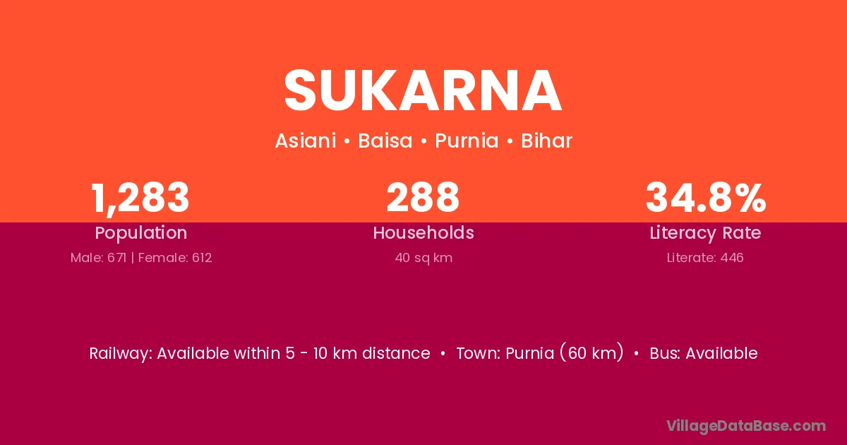 Purnia (60 km) is the nearest town to Sukarna village for major economic activities and is located approximately 60 km away.