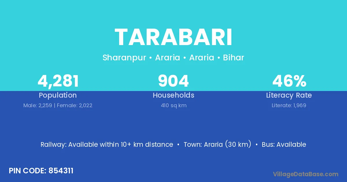 Purnia (84 km) is the nearest town to Tarabari village for major economic activities and is located approximately 84 km away.