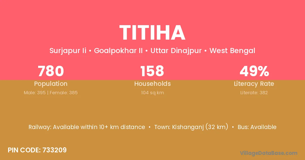Kishanganj (28 km) is the nearest town to Titiha village for major economic activities and is located approximately 28 km away.
