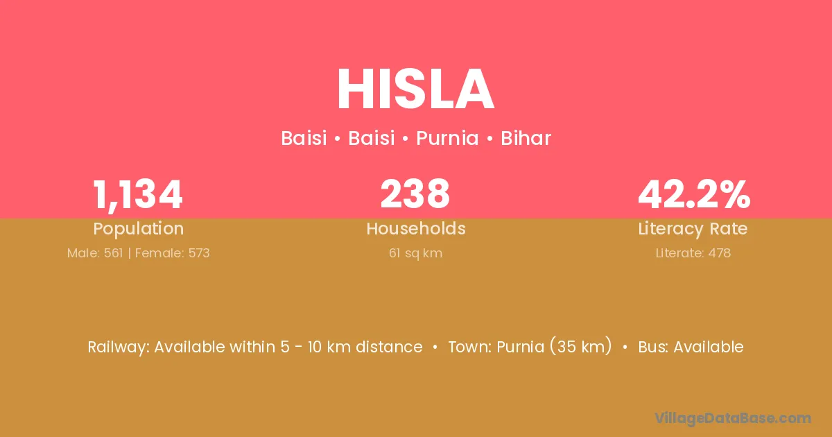 Purnia (35 km) is the nearest town to Hisla village for major economic activities and is located approximately 35 km away.