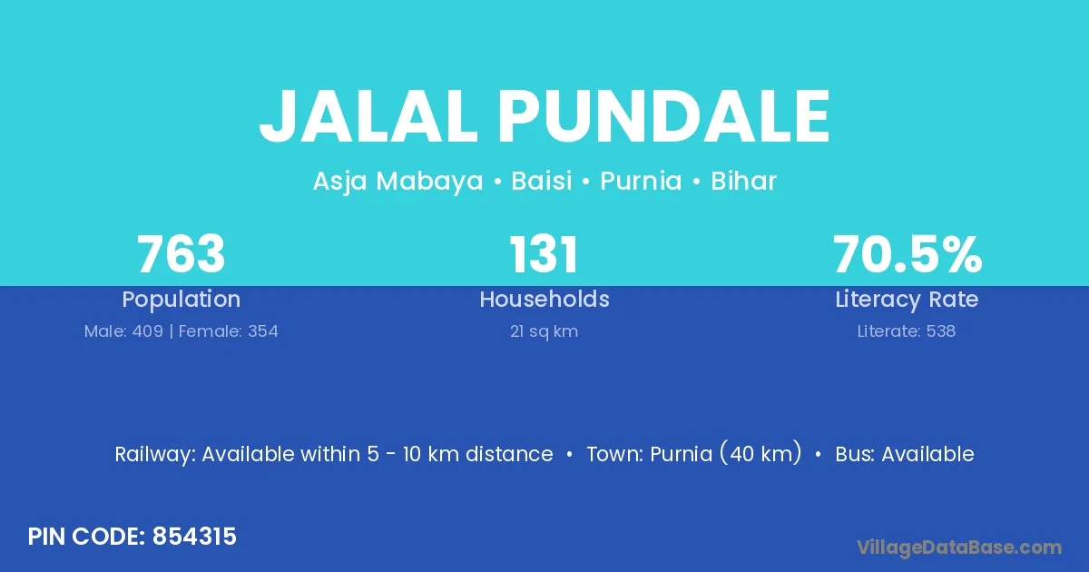 Purnia (40 km) is the nearest town to Jalal Pundale village for major economic activities and is located approximately 40 km away.