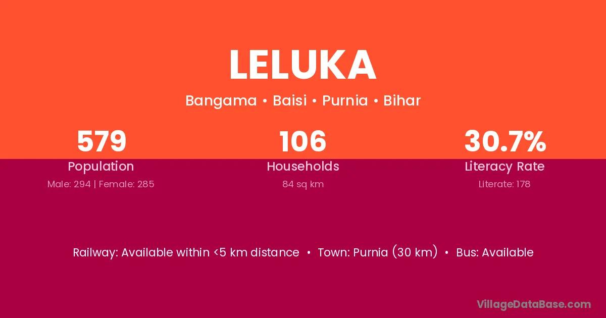 Purnia (30 km) is the nearest town to Leluka village for major economic activities and is located approximately 30 km away.