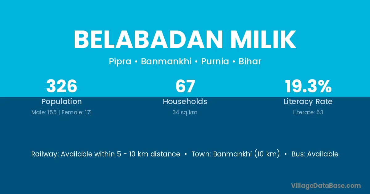 Banmankhi (10 km) is the nearest town to Belabadan Milik village for major economic activities and is located approximately 10 km away.
