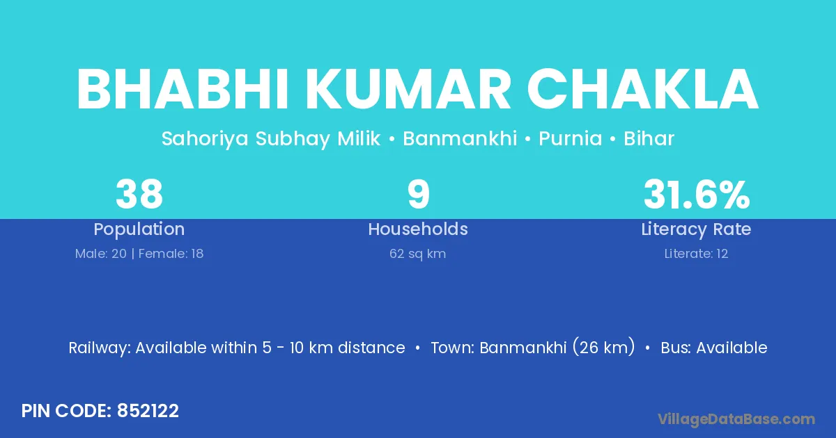 Banmankhi (26 km) is the nearest town to Bhabhi Kumar Chakla village for major economic activities and is located approximately 26 km away.