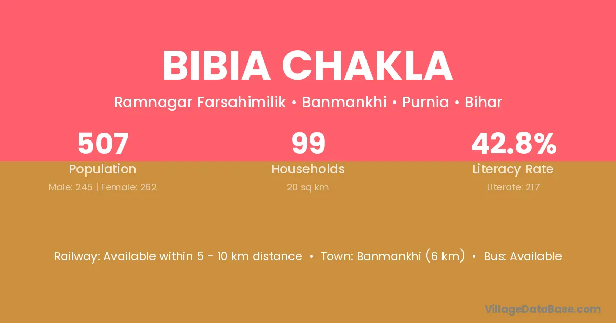 Banmankhi (6 km) is the nearest town to Bibia Chakla village for major economic activities and is located approximately 6 km away.
