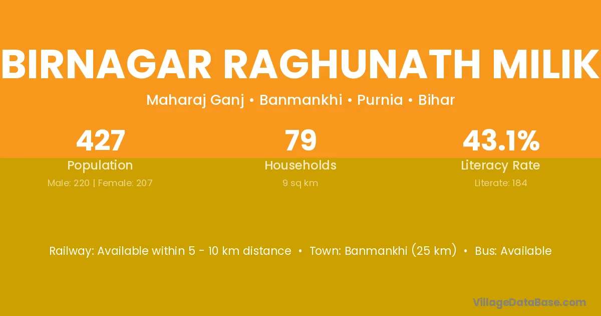 Birnagar Raghunath Milik village has a total population of 427 people, of which 220 are males and 207 are females.