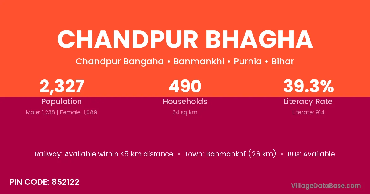 Banmankhi' (26 km) is the nearest town to Chandpur Bhagha village for major economic activities and is located approximately 26 km away.