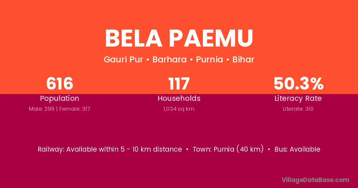 Purnia (40 km) is the nearest town to Bela Paemu village for major economic activities and is located approximately 40 km away.