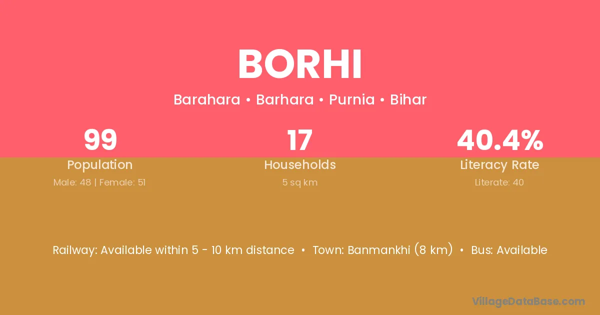 Banmankhi (8 km) is the nearest town to Borhi village for major economic activities and is located approximately 8 km away.