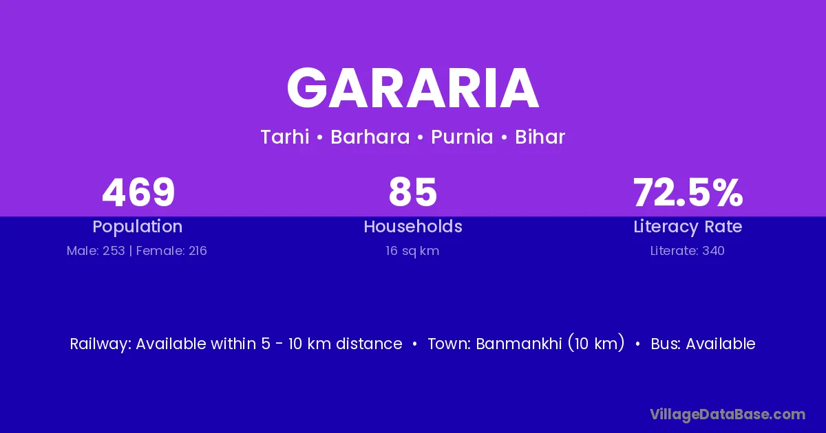 Banmankhi (10 km) is the nearest town to Gararia village for major economic activities and is located approximately 10 km away.