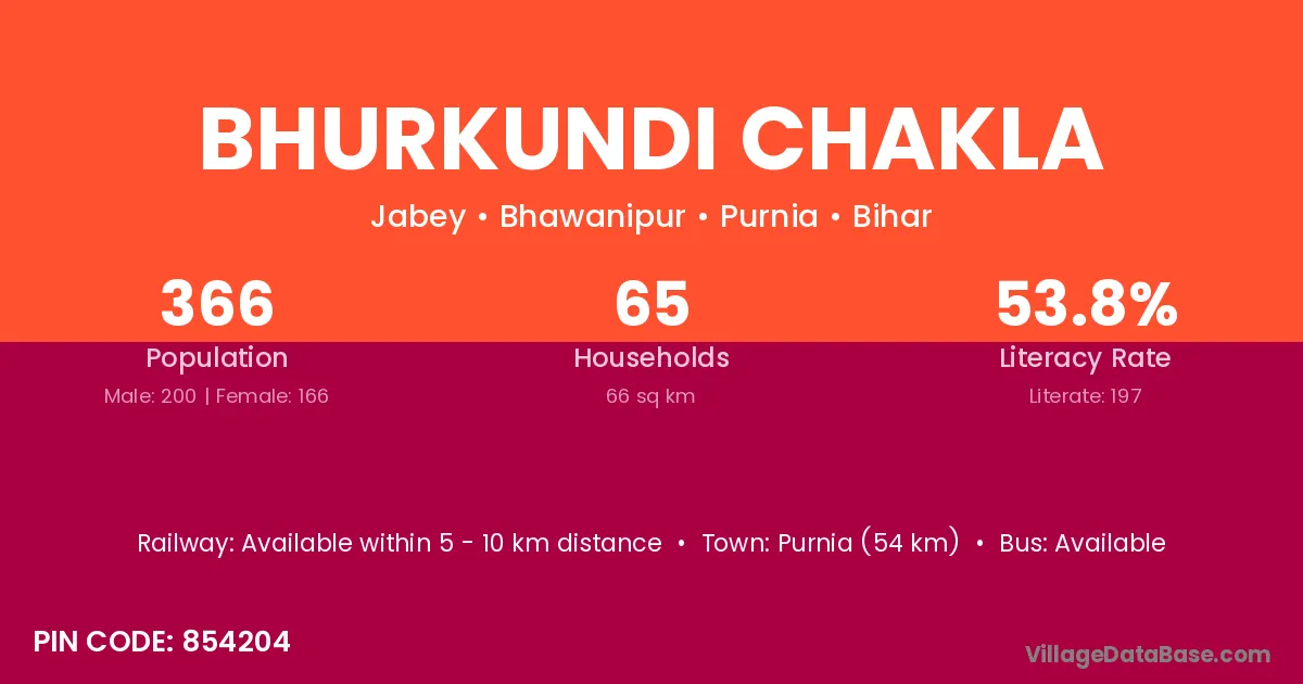 Purnia (54 km) is the nearest town to Bhurkundi Chakla village for major economic activities and is located approximately 54 km away.