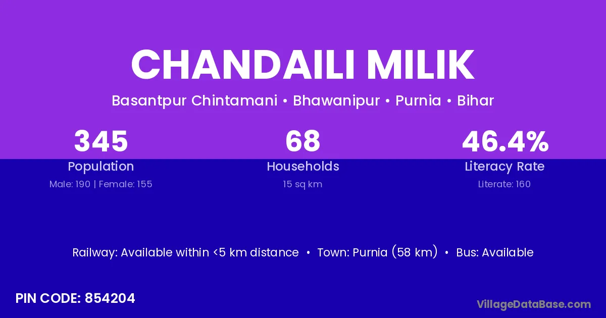 Purnia (58 km) is the nearest town to Chandaili Milik village for major economic activities and is located approximately 58 km away.