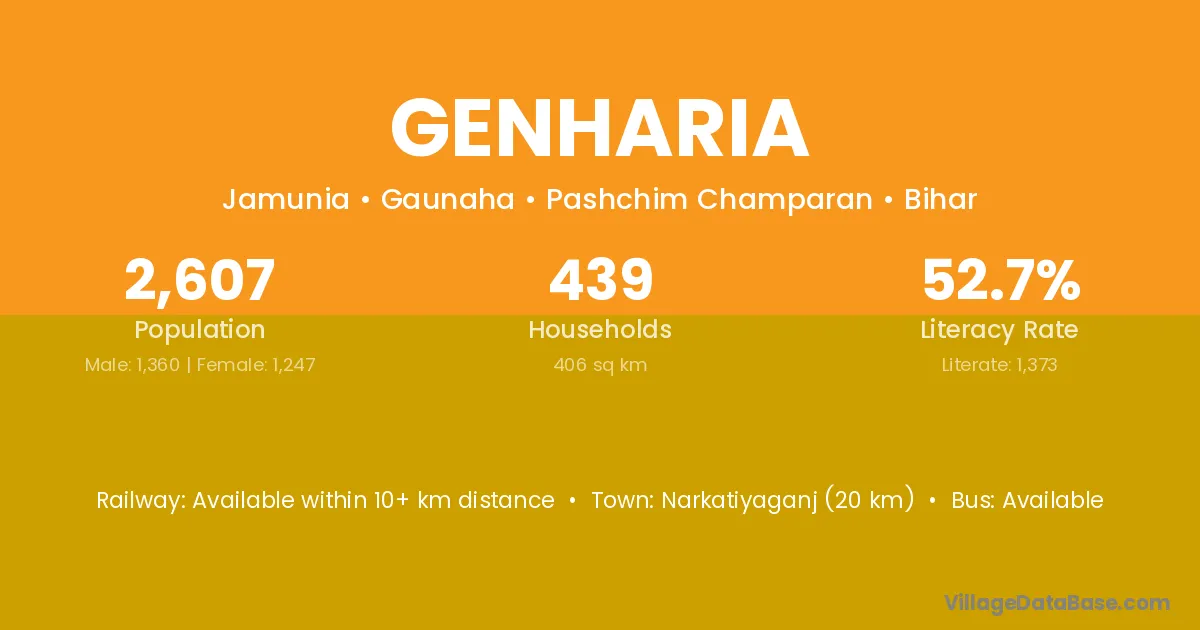 Purnia (62 km) is the nearest town to Genharia village for major economic activities and is located approximately 62 km away.