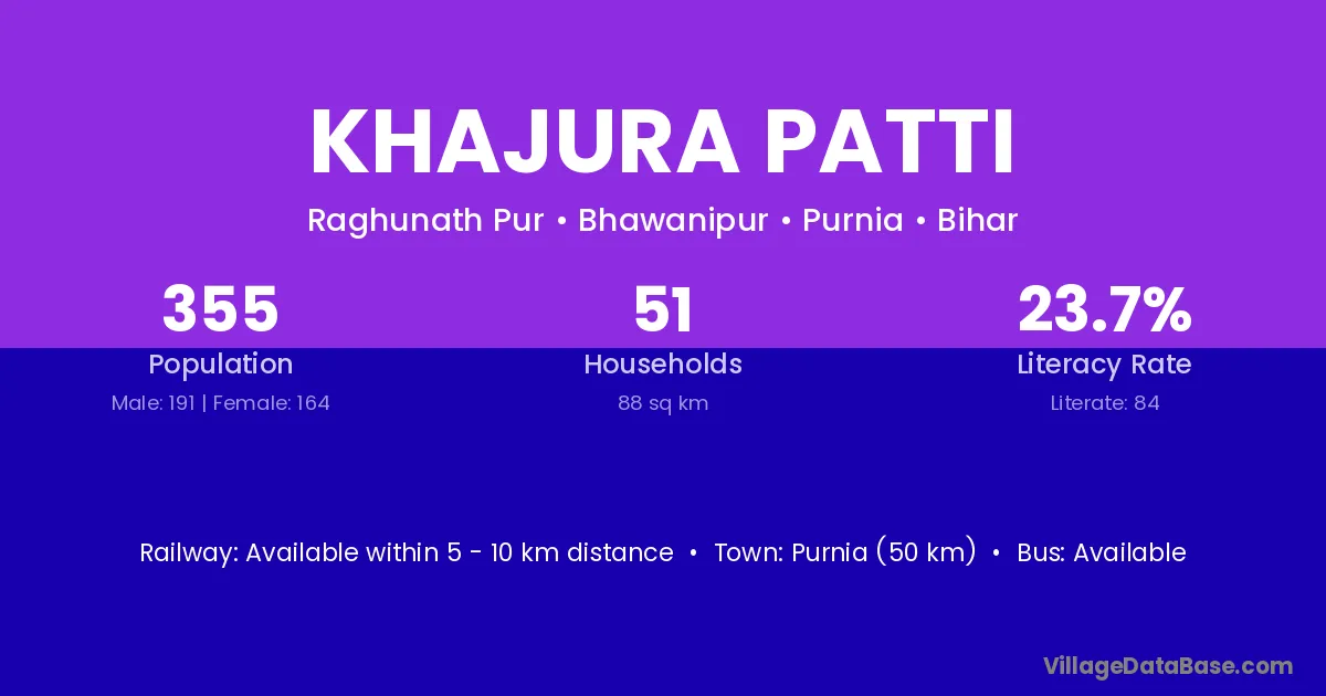 Purnia (50 km) is the nearest town to Khajura Patti village for major economic activities and is located approximately 50 km away.