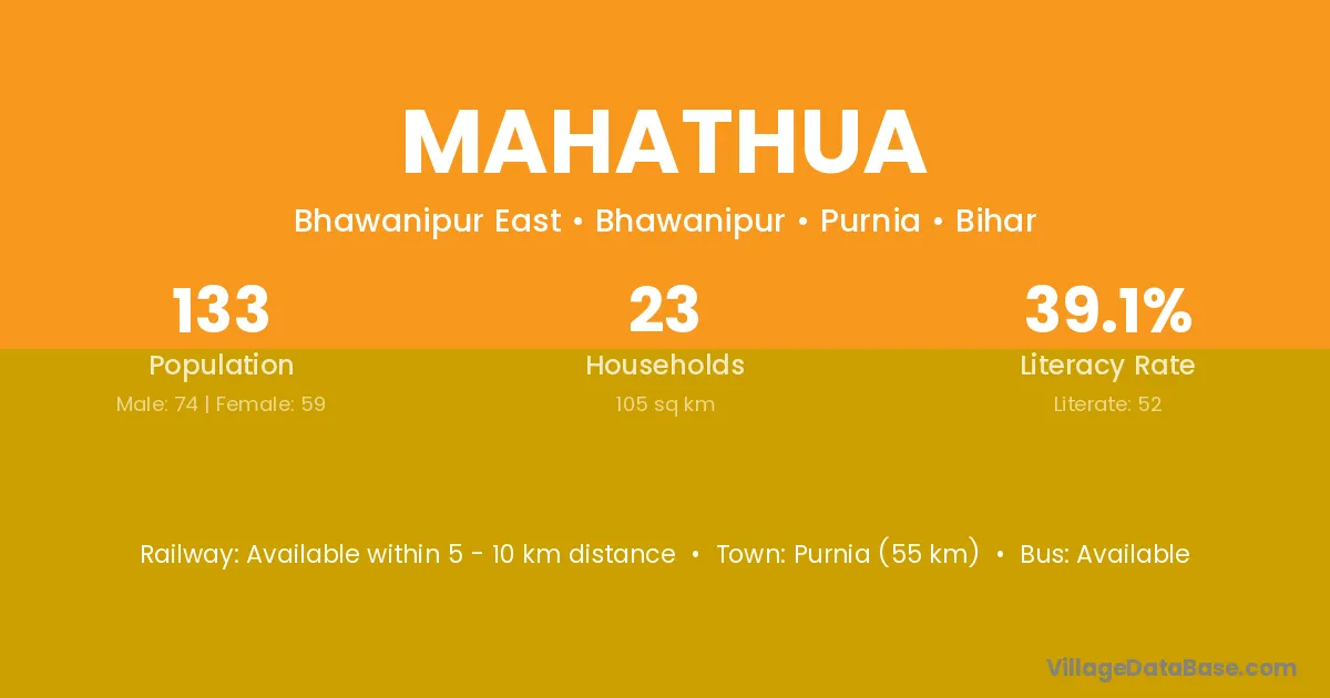 Purnia (55 km) is the nearest town to Mahathua village for major economic activities and is located approximately 55 km away.