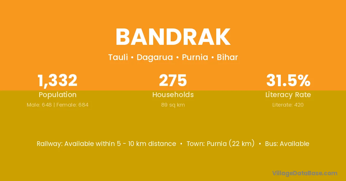 Purnia (22 km) is the nearest town to Bandrak village for major economic activities and is located approximately 22 km away.