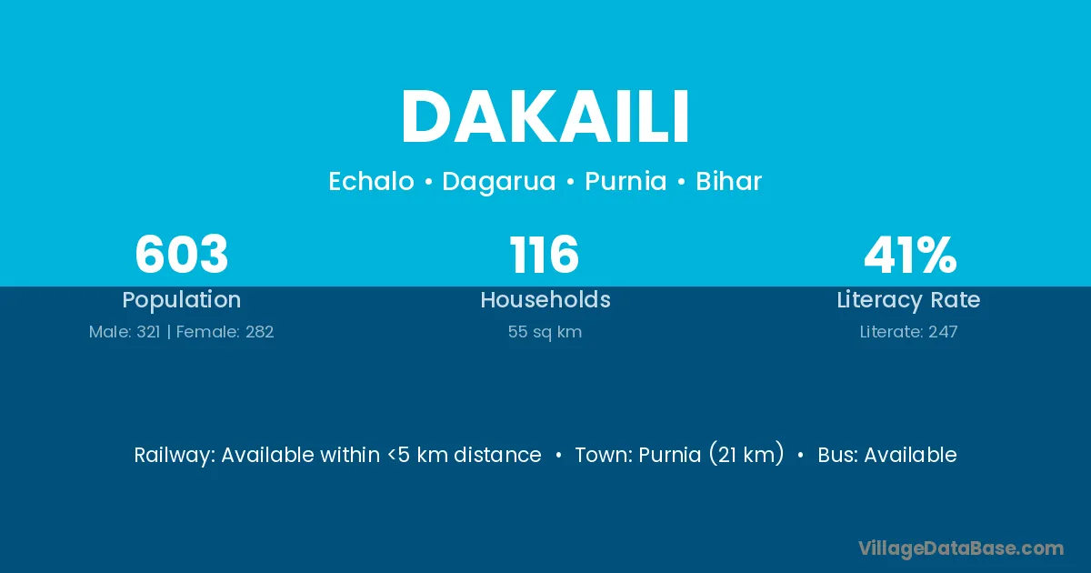 Purnia (21 km) is the nearest town to Dakaili village for major economic activities and is located approximately 21 km away.