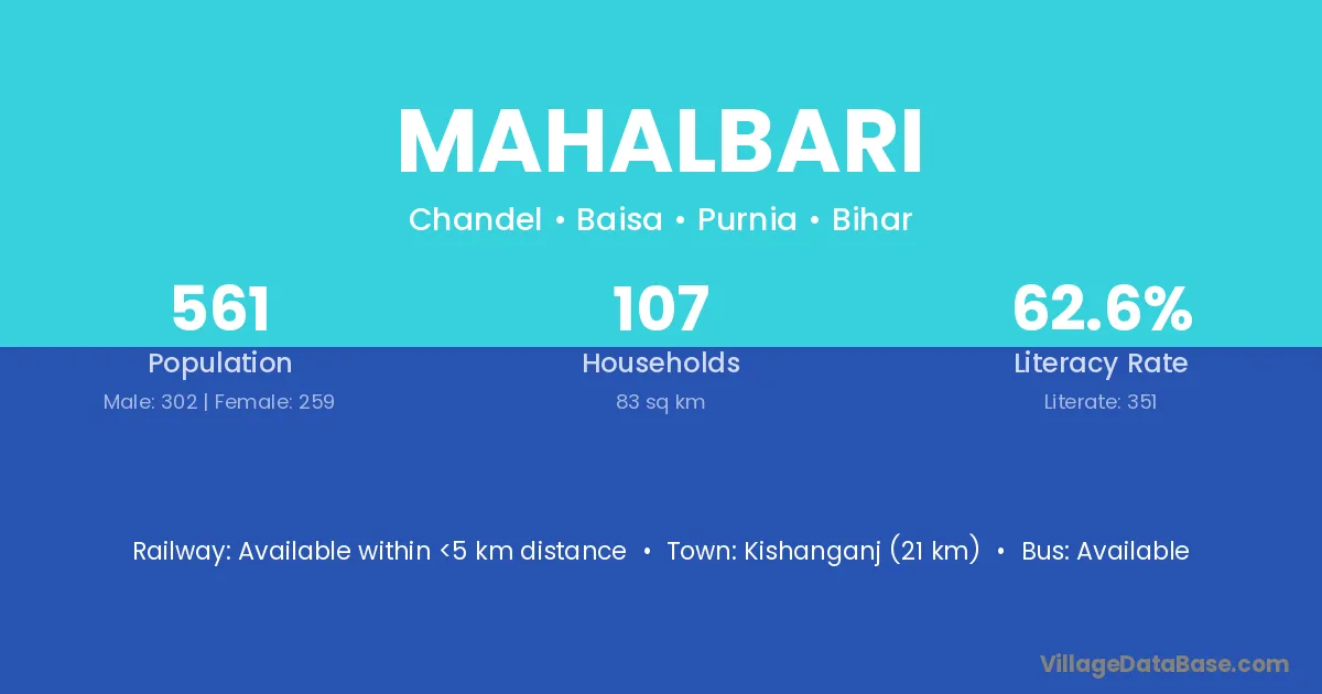 Purnia (22 km) is the nearest town to Mahalbari village for major economic activities and is located approximately 22 km away.