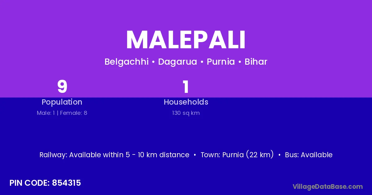 Purnia (22 km) is the nearest town to Malepali village for major economic activities and is located approximately 22 km away.