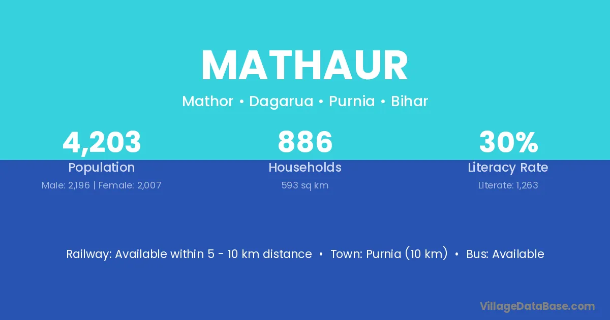 Purnia (10 km) is the nearest town to Mathaur village for major economic activities and is located approximately 10 km away.