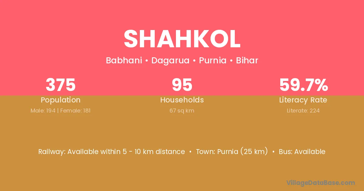 Purnia (25 km) is the nearest town to Shahkol village for major economic activities and is located approximately 25 km away.