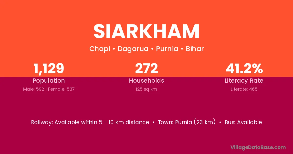 Purnia (23 km) is the nearest town to Siarkham village for major economic activities and is located approximately 23 km away.