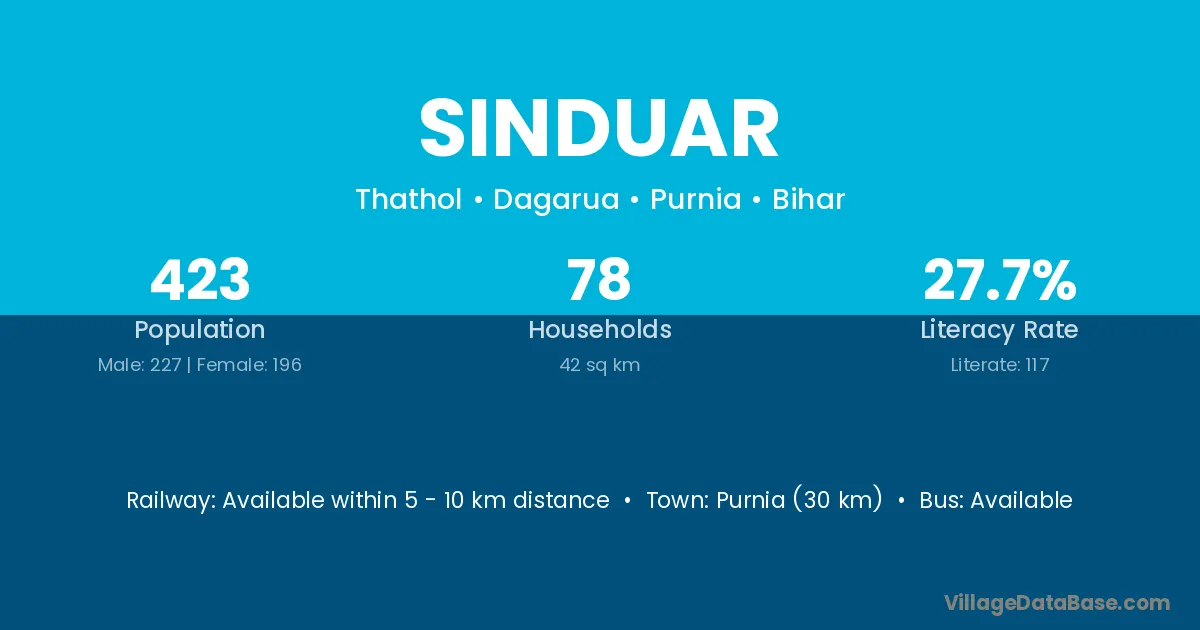 Purnia (30 km) is the nearest town to Sinduar village for major economic activities and is located approximately 30 km away.