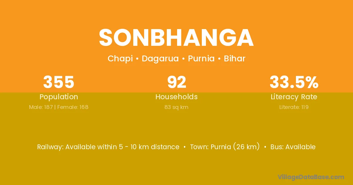 Purnia (26 km) is the nearest town to Sonbhanga village for major economic activities and is located approximately 26 km away.