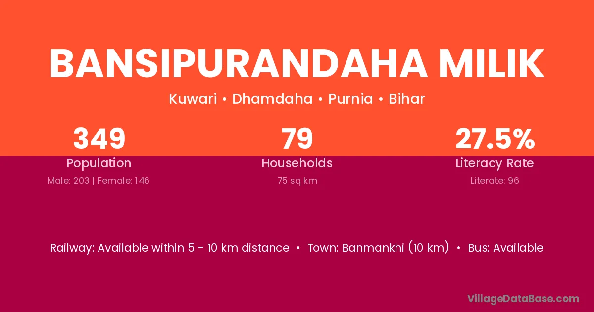 Bansipurandaha Milik village has a total population of 349 people, of which 203 are males and 146 are females.