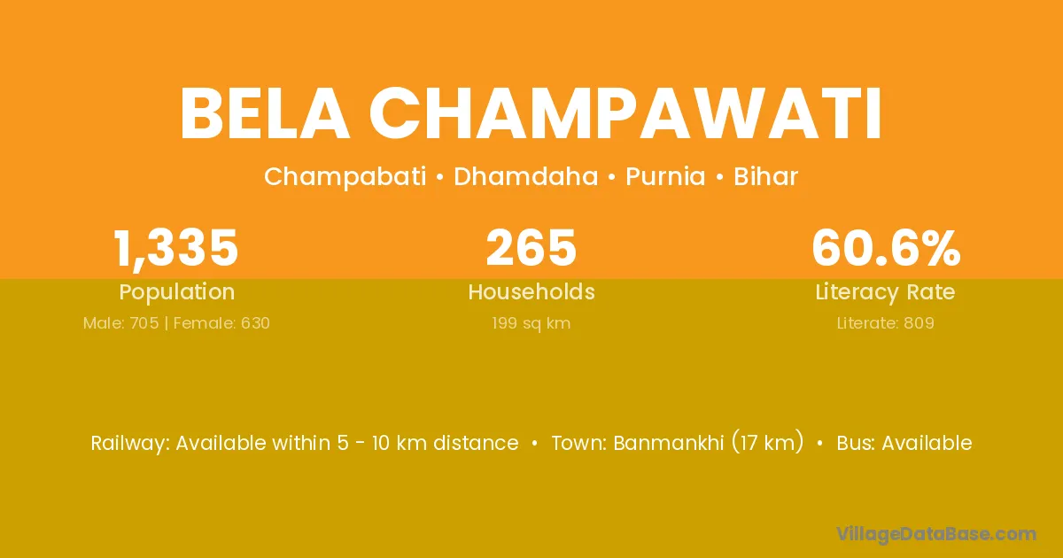 Banmankhi (17 km) is the nearest town to Bela Champawati village for major economic activities and is located approximately 17 km away.