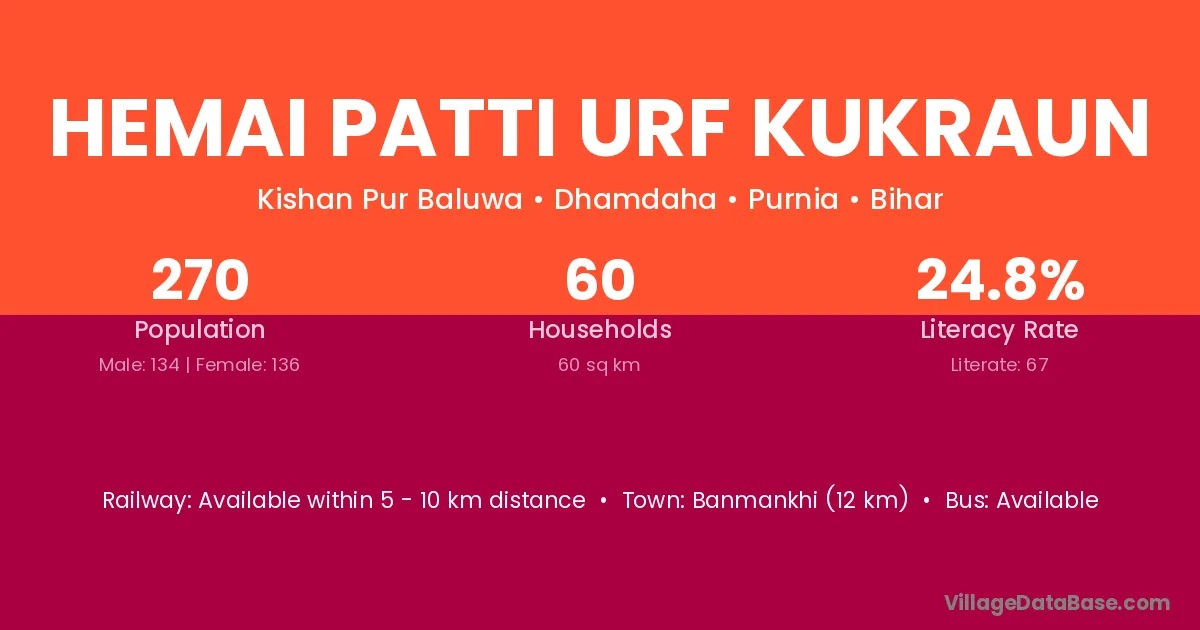 Banmankhi (12 km) is the nearest town to Hemai Patti Urf Kukraun village for major economic activities and is located approximately 12 km away.