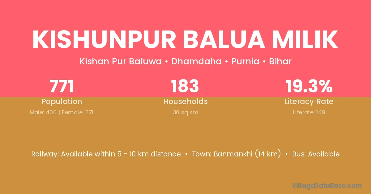 Banmankhi (14 km) is the nearest town to Kishunpur Balua Milik village for major economic activities and is located approximately 14 km away.