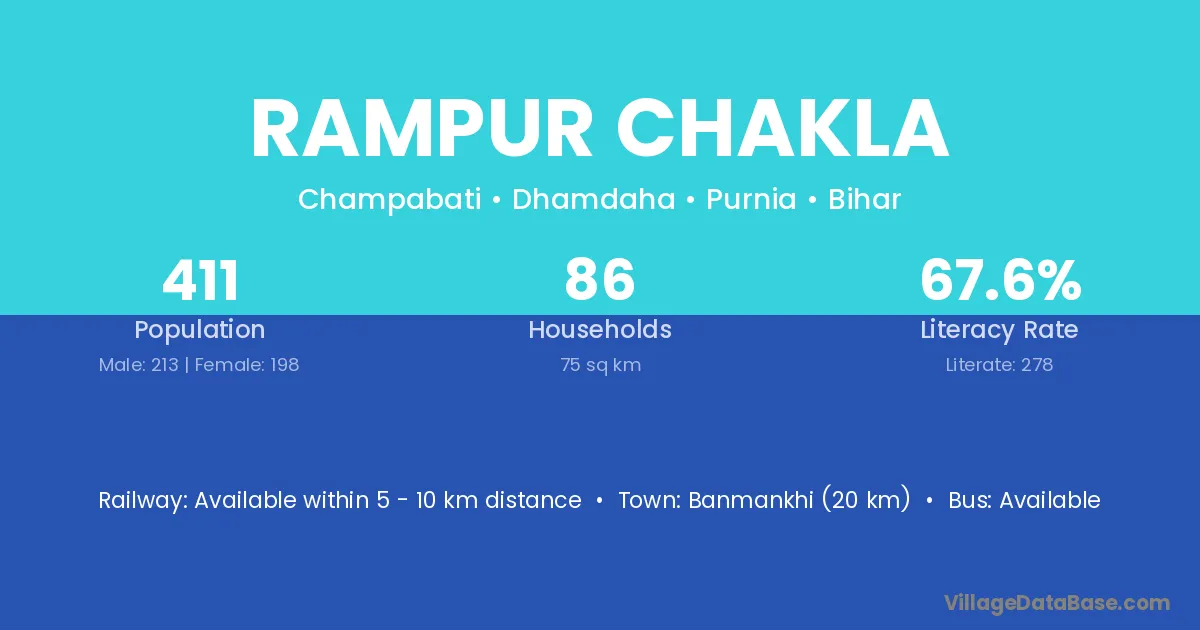 Banmankhi (20 km) is the nearest town to Rampur Chakla village for major economic activities and is located approximately 20 km away.