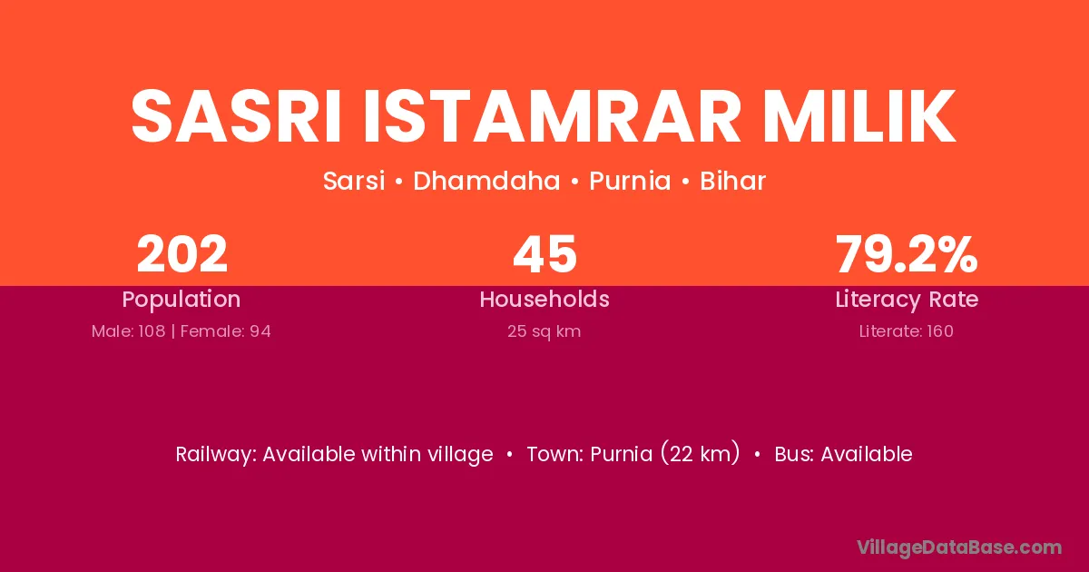 Purnia (22 km) is the nearest town to Sasri Istamrar Milik village for major economic activities and is located approximately 22 km away.