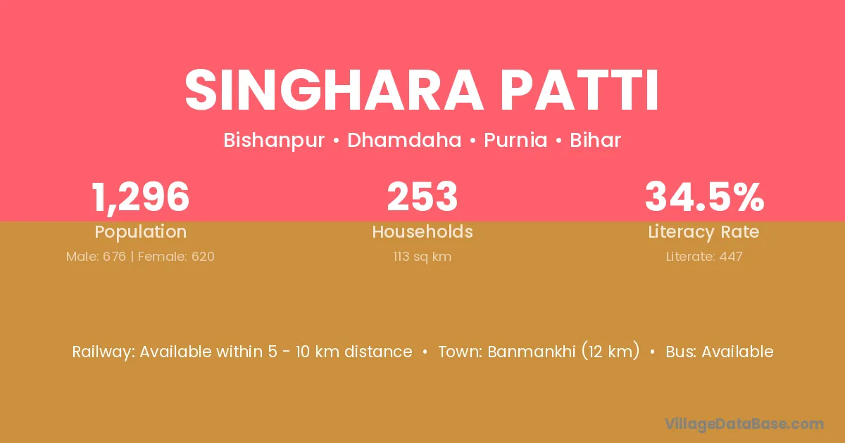 Banmankhi (12 km) is the nearest town to Singhara Patti village for major economic activities and is located approximately 12 km away.