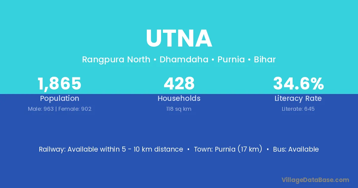 Purnia (17 km) is the nearest town to Utna village for major economic activities and is located approximately 17 km away.