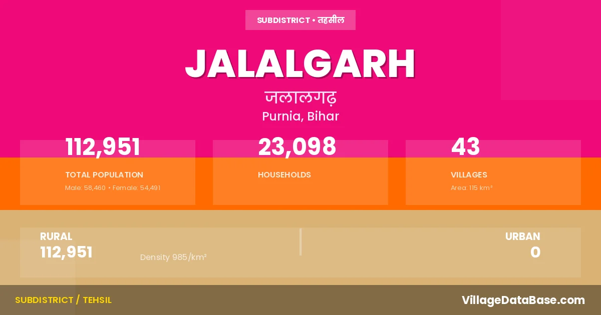 According to the 2011 census The total area of Jalalgarh Subdivision is 115 km², with a population of 112951 people. The population density is 985 inhabitants per square kilometre, and there are approximately 23098 houses in the sub district.