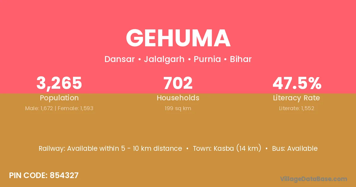 Kasba (14 km) is the nearest town to Gehuma village for major economic activities and is located approximately 14 km away.