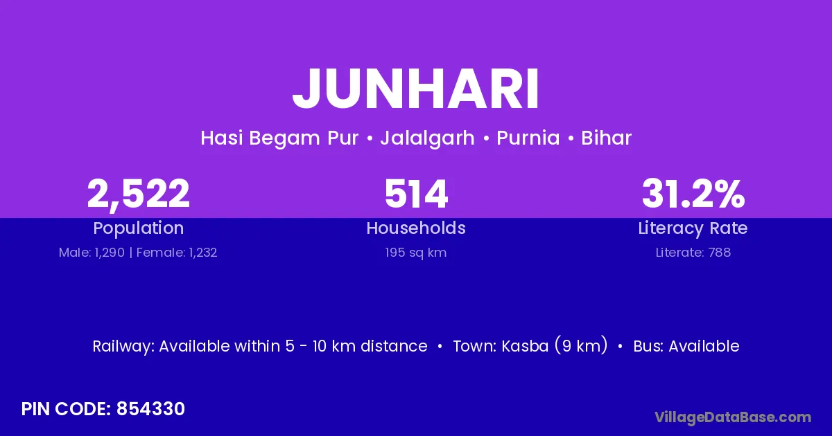 Kasba (9 km) is the nearest town to Junhari village for major economic activities and is located approximately 9 km away.
