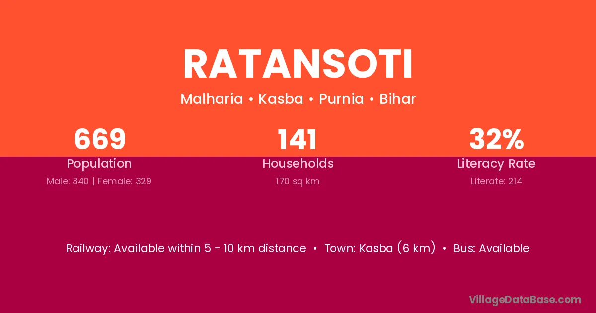 Kasba (6 km) is the nearest town to Ratansoti village for major economic activities and is located approximately 6 km away.