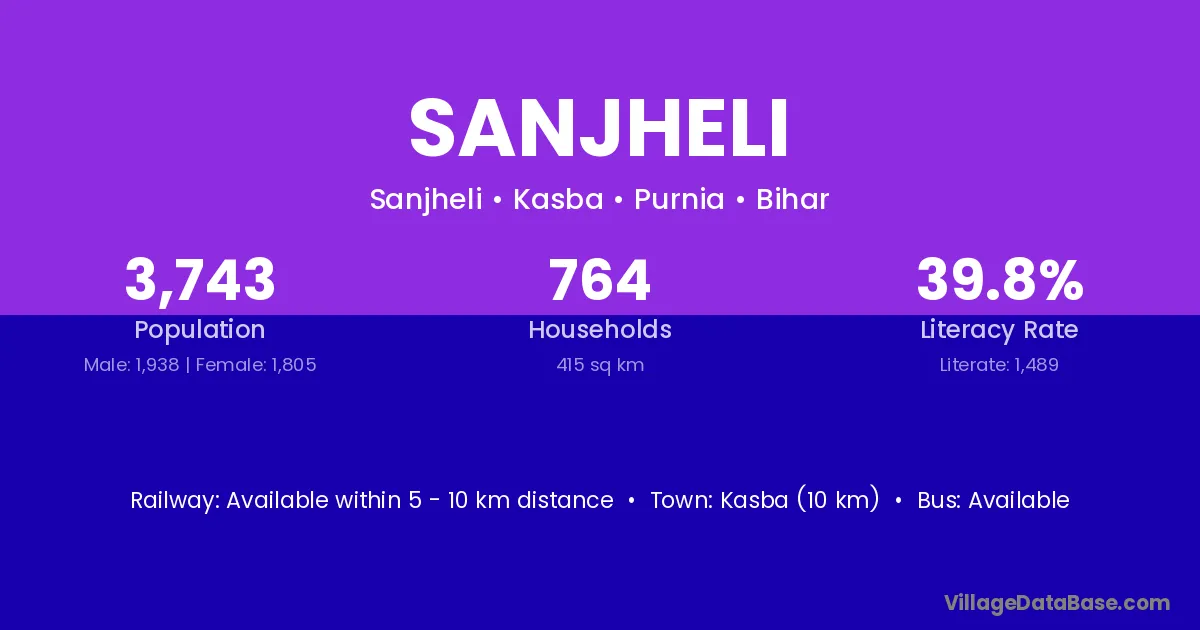 Kasba (10 km) is the nearest town to Sanjheli village for major economic activities and is located approximately 10 km away.