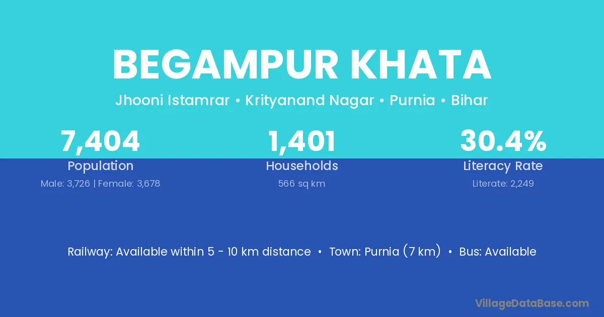 Purnia (7 km) is the nearest town to Begampur Khata village for major economic activities and is located approximately 7 km away.